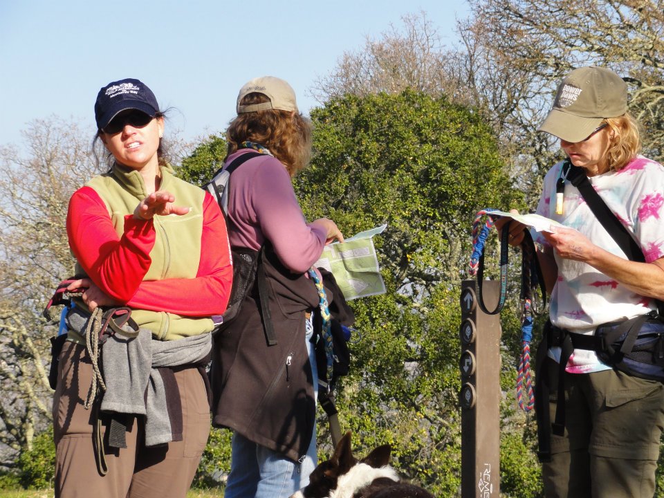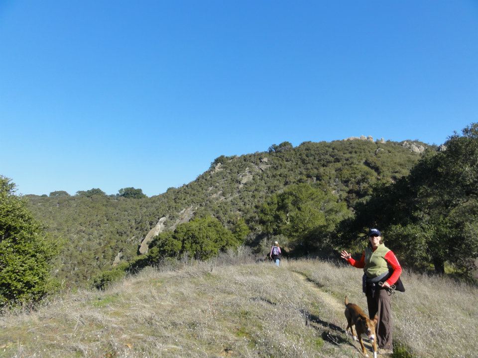 Picked up a friend and her two dogs (Steamer and Carson) and finished the hour drive to Las Trampas, one of the East Bay Regional Open Space Districts, where we met up with three other agility friends and their dogs. So: Five agility people, ten agility dogs.