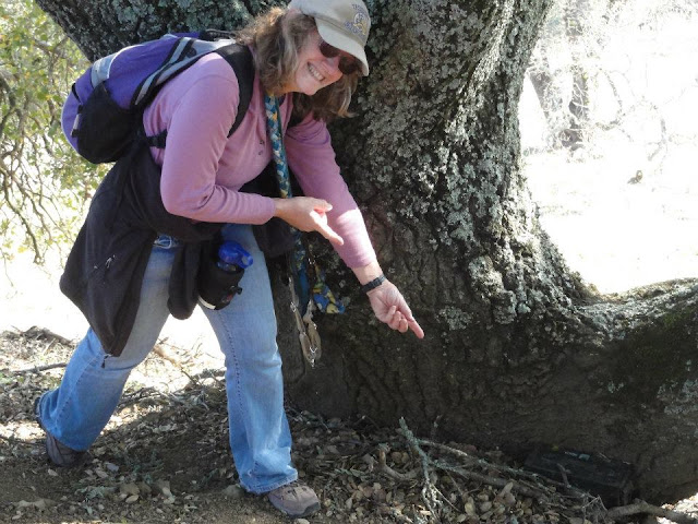 (Large black lunchbox thingie, hidden in plain sight, just 10 feet off the trail! Oh, and down a really steep slope. Photos from Barbara S.)