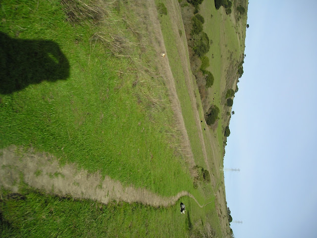 I'm intending to follow the roads and walkways, but suddenly notice that the unbuilt part of the hill is grassy and not off limits. So we climb up the hill to the fence line and follow the ridge up to the top. This is such a pleasant surprise--we're far enough away from everyone and everything that I let the dogs off leash for a few minutes as we walk. This looks back down the fenceline. Off in the left distance, that huge green area? The future Martial Cottle Park, and Taj MuttHall  is on the right side of that somewhere.
