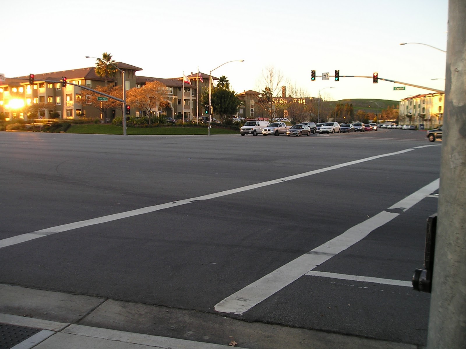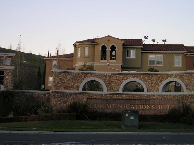 Another half a mile, and we had to wait 2 or 3 minutes at this huge and very busy intersection. Communication  Hill--our goal--is visible below the traffic lights.