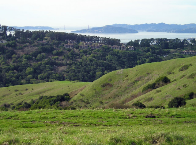 The cool thing is that the hill is just an 8-minute drive from here. I had been over there before looking for exercise but found just closely packed houses lining narrow streets. I hadn't found the nice windy uphill road with grass on both sides and a view (well--if there was no fog--), or those amazing stairs in the park. I'll try to get over there more often on my own.