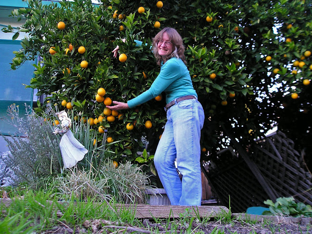 Plus this photo of me hugging my orange tree is specifically for Lisa of Mutts and a Klutz. So you can enjoy San Jose vicariously while you are having Canada kinds of climate.