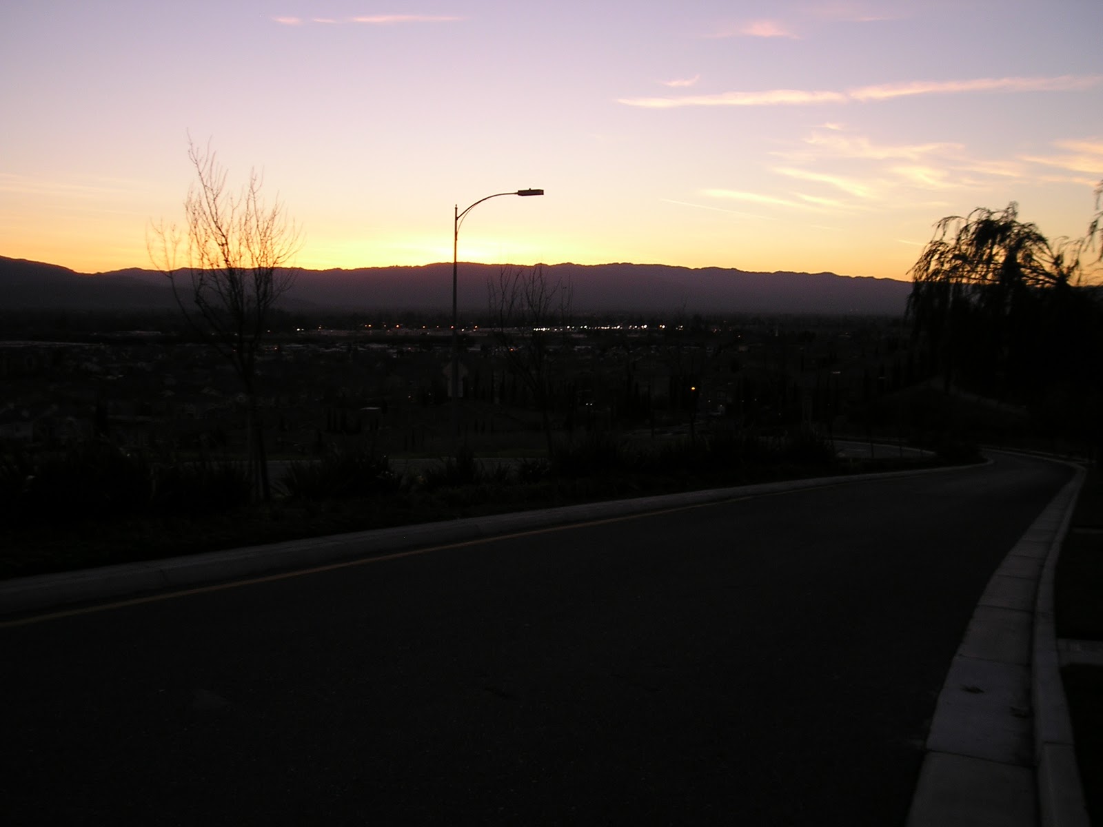 Looking back along the road we've walked up, the sunset starts coloring the sky.