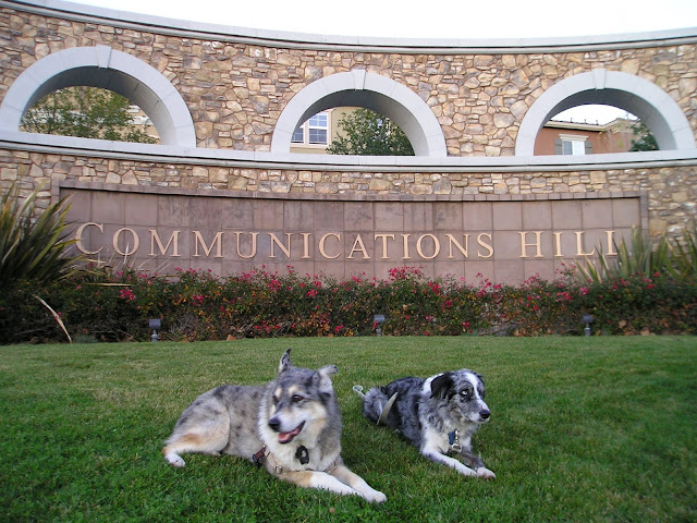 I *am* on communication hill--and there's the big communication tower.  We're at the top of the ridge, now, also a surprise to be able to get this high. The dogs are happily sniffing and the sky is lovely. In a couple of months, this will all start going to foxtails, but right now, what a glorious hidden retreat with tightly crowded buildings just below us.