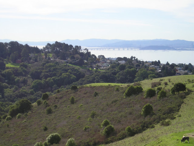 We started up the hill, and halfway I could see the Santa Cruz mountains making stunning layers of blue. Cheap camera makes it very grainy.