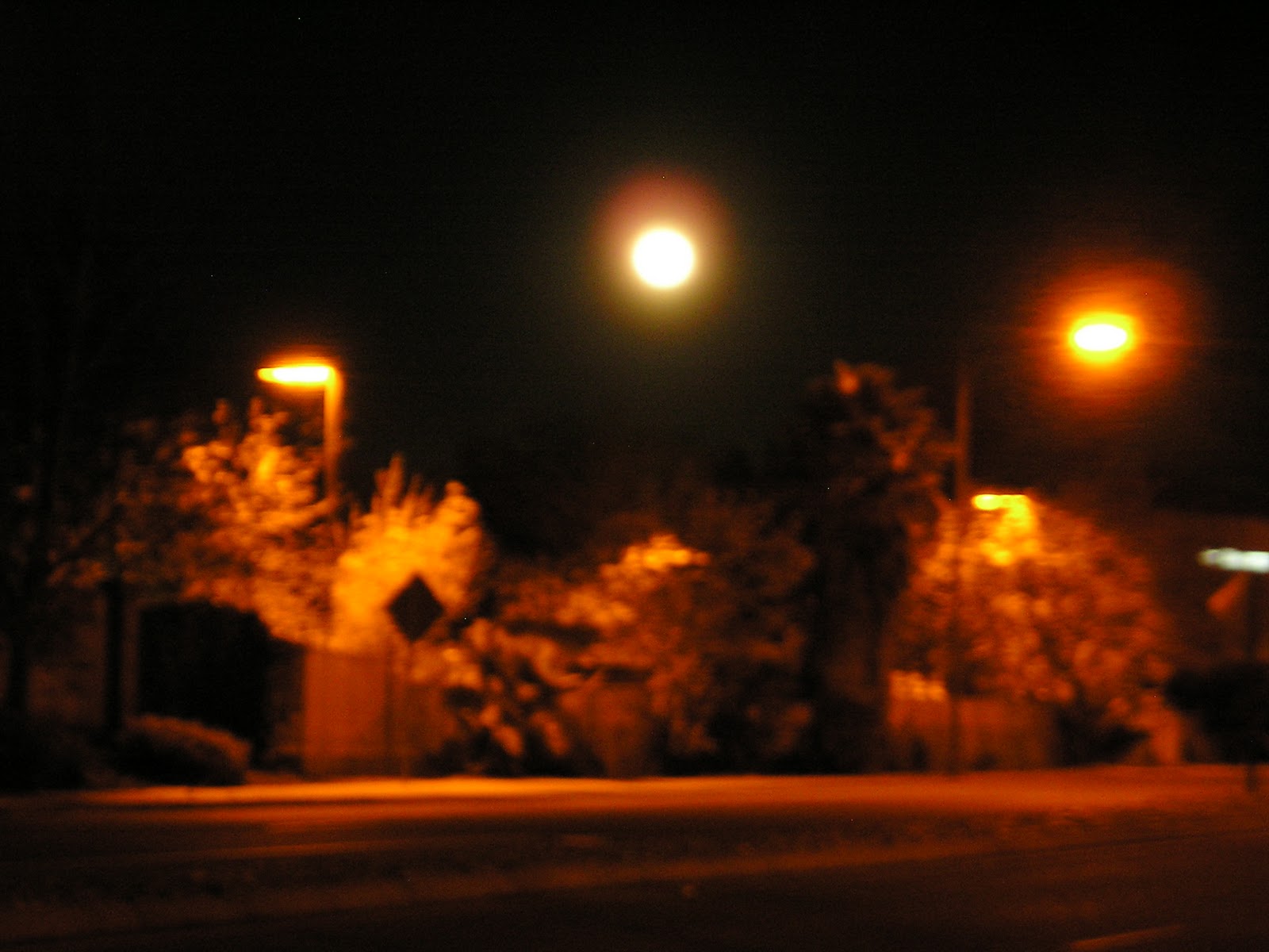 Still no moon visible, and it's getting dark, so we wind around the hill a bit, up and down 100 stairs, and head home. Partway there, the moon finally makes herself visible. Crappy camera.
