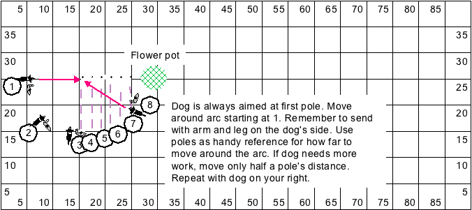 Next, I will do a similar pattern arcing around the other side of the poles, with the dog first on my right, then on my left.