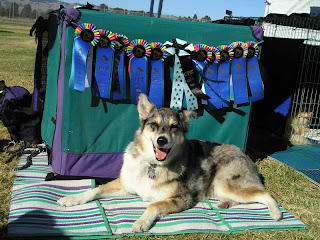Boost missed BOTH Snookers, and one Standard where I misjudged a handling situation so she jumped a jump in the wrong direction, but she also finished her level 5 fun title, and Tika got her first EX title, EXSt (Standard--that's 30 Level C Qs--in the range of a USDAA Gold title).