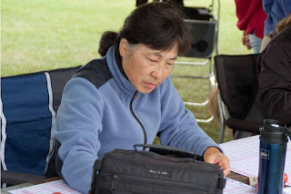 Sunday was a little more efficient. At the end of the day, we announced the winners of the Kevin Gast Memorial Award, which goes to the highest-scoring novice dog (defined as level 1, 2, or 3, who is not in a higher level in any other organization, either). Kevin was a fun guy who died suddenly and too young in 2008. Here's my photo of a blown-up photo they displayed of him and his shelties.