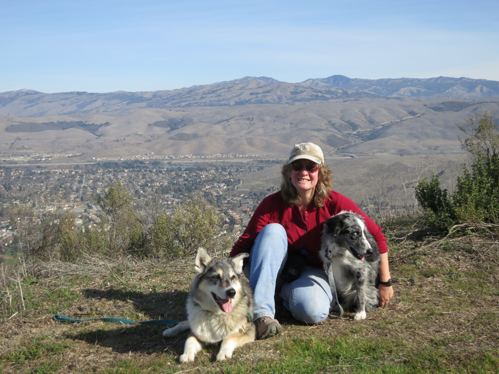 Atop Coyote Peak--cumulative elevation gain of 1400 feet--we stopped for a variety of photos, including my usual pose with the Merle Girls at the usual place, but I got an unusual ear-kiss from the Booster in the process.