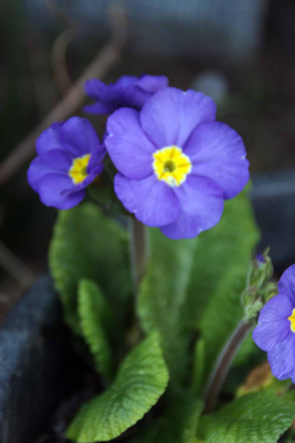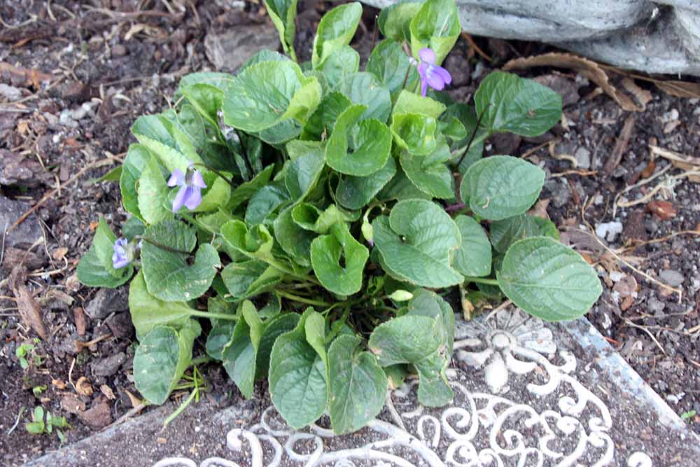 The violets, with their big round leaves and their just-so little purple flowers, can also be invasive, but right now in their blooming season they look gorgeous. |