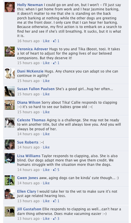 Keep in mind that she's still healthy and strong. Just because some of her hearing is going doesn't mean she's a different dog than she was a week ago. She's still the best damn Craussie I know!