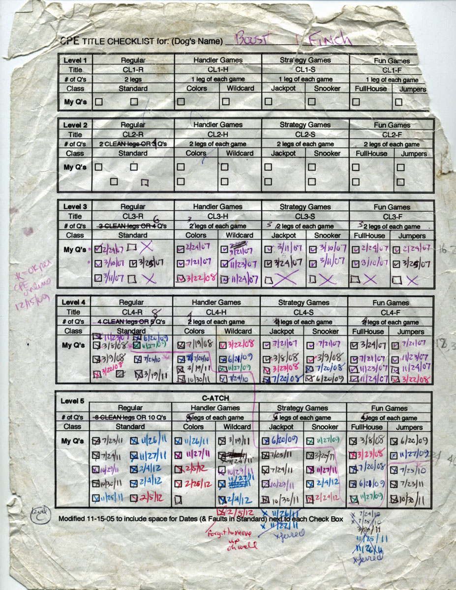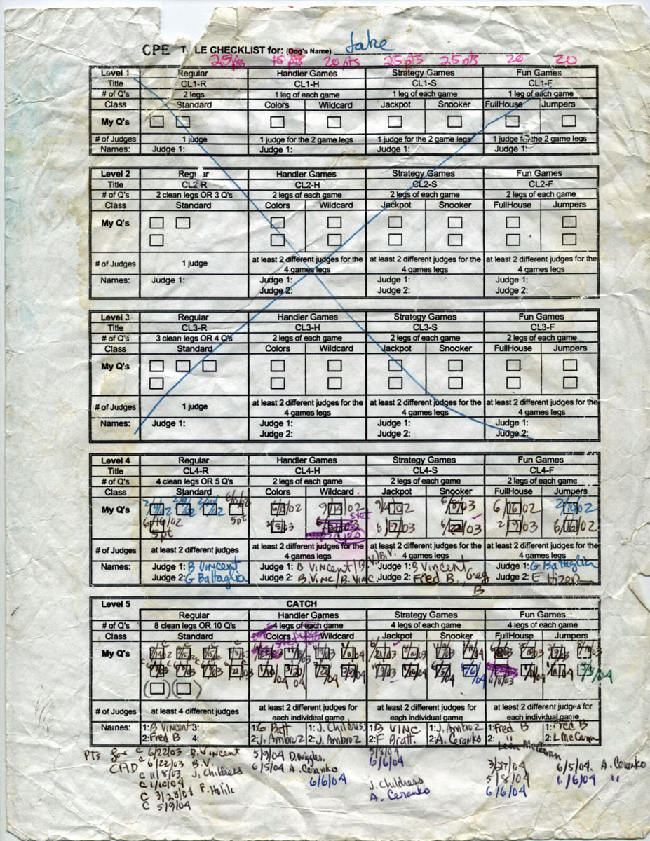 When CPE first started, if your dog had a championship in another organization, you could start at Level 4, which is what I did with Jake. So, between that and the lower number of required Qs, Jake needed 48 Qs to work his way up to his C-ATCH.