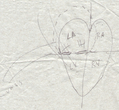 The vet kindly drew a sketch on a paper towel of what's going on with Tika's heart. High-tech! This drawing is reversed from above--Left Atrium (LA) and Ventricle (LV) are on the left here.