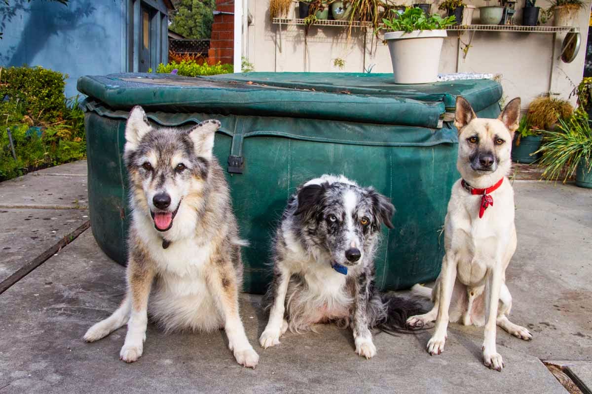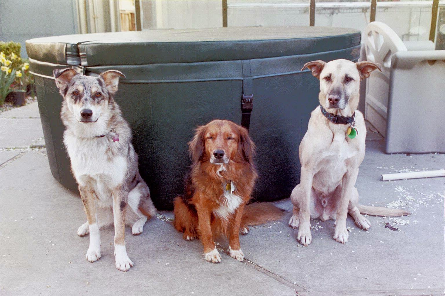 2015: Tika, Boost, Chip, taken as I knew that Tika couldn't be around much longer. Already having trouble sitting comfortably--but she managed it for me, briefly. All three of them were such good dogs on this day.