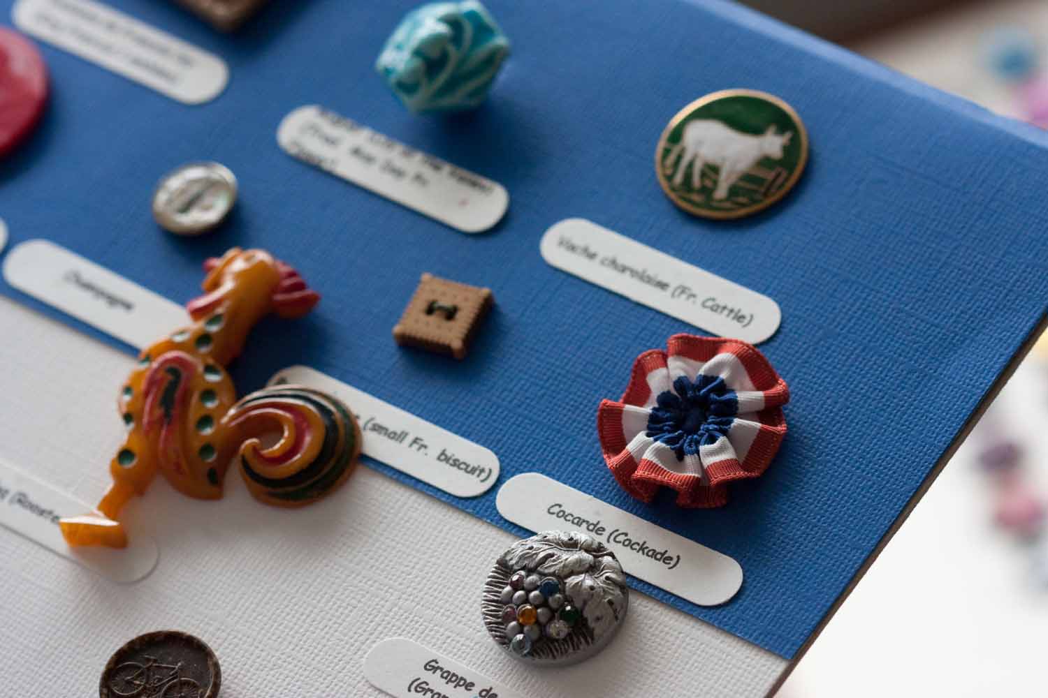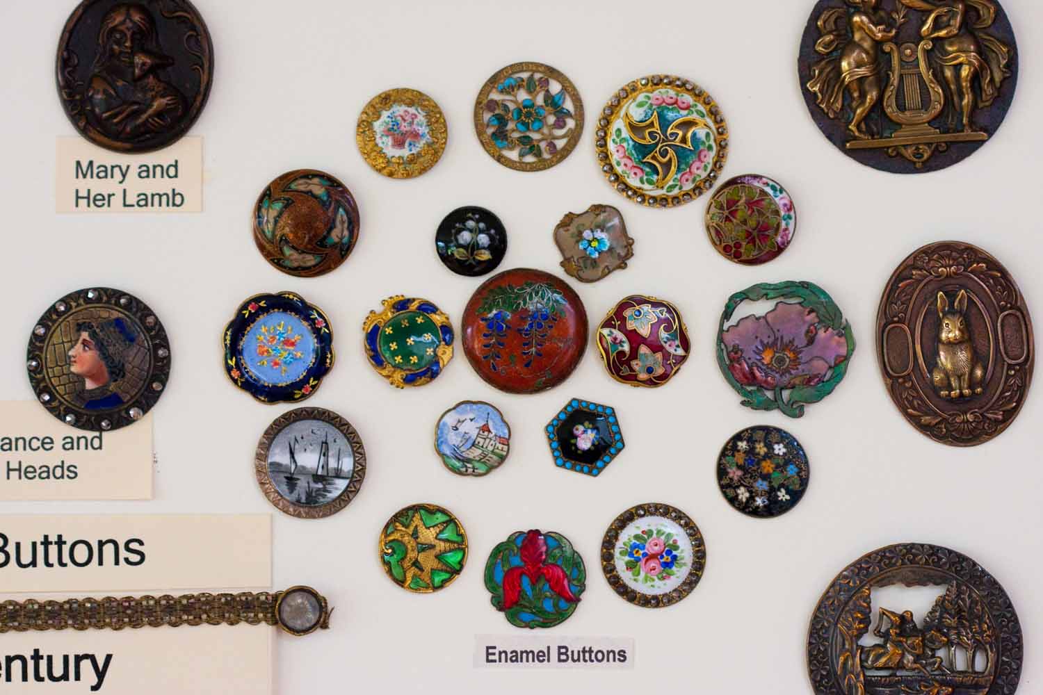 She creates attractive displays of related buttons, many of which hang on her walls.