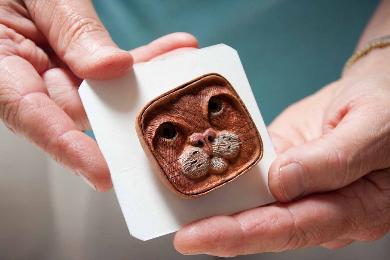 She knows all the art-button crafters in the area, too, and buys their one-of-a-kind buttons (sorry, dogs, had to get this gorgeous cat one in):