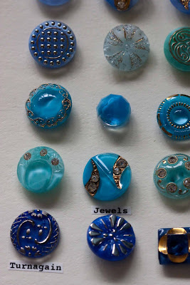 I don't even remember all the ways that they were grouped, but she pulled out card after card of amazingly crafted buttons of diverse materials and origins. And showed us her bookcase full of button books, which she's mostly memorized so that she can recognize the good buttons when she finds them at garage or estate sales or antique shops. Here's still more:
