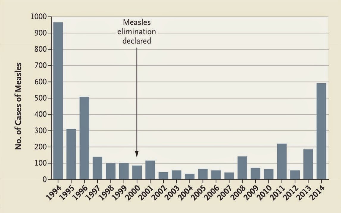 From AP, Jan. 23, 2015 (that would be yesterday): "A major measles outbreak traced to Disneyland..." [starting in mid-December] ...[has sickened 70 people, most traced back to Disneyland.] "To control this latest outbreak, those who are not vaccinated were warned this week to stay away from Disney theme parks." "Disney employees who have no proof of immunization and may have come into contact with sick colleagues were placed on paid leave until they are given the medical all-clear." |