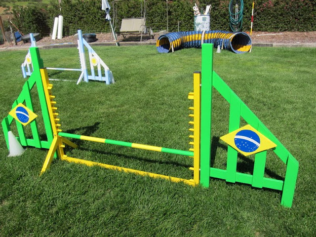 Jim B has been refurbishing and building jumps for use at Power Paws, and I love love LOVE the glossy paints he's using; the colors gleam at me and lift my spirits. But, even more, he's now deliberately turning the agility field into an international experience for those of us who tend to stick close to home with our dogs.