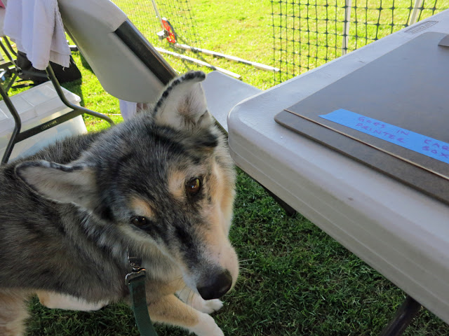 We also were able to run Jumpers. It was a gnarly course (in the negative sense) and the Q rate was low: Only 6 of the 28 dogs in Boost's height Qualified... including Boost! That's Jumpers Qs two trials in a row! Holy mackerel! AND a fourth-place ribbon! (It wasn't a pretty run, way too many turns in the wrong direction, but she kept all her bars up and didn't run past anything.)