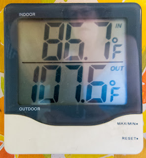 Visalia (as many aren't), it's a "small" community of merely 124,000 people that takes about 3 hours of mostly smooth freeway driving from my place to put you smack dab in the middle of California's Central Valley. The average high temperature for the month of August is 93.3F (34.1C) and overnight low average is 64.8F (18.2C). Believe me, it's been plenty much warmer on many years. The big appeal to counter the heat is that we've slept on the in-laws' huge back lawn in the shade of glorious old trees and plunged into the clear blue swimming pool as needed.